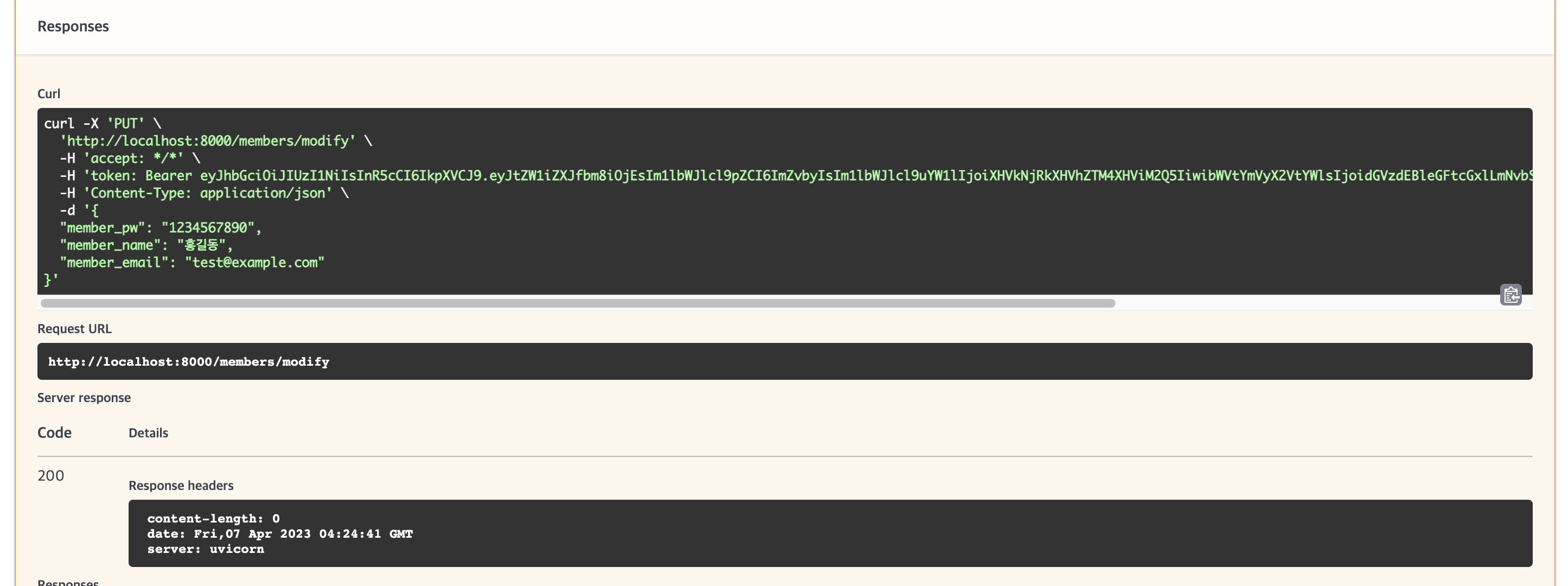 회원 정보를 변경할 때는 request 헤더에 로그인할 때 발급받은 access_token을 포함하여야 한다. 이 때 값의 형태는 "Bearer ...." 이와 같이 앞에 Bearer를 붙여 주어야 한다.