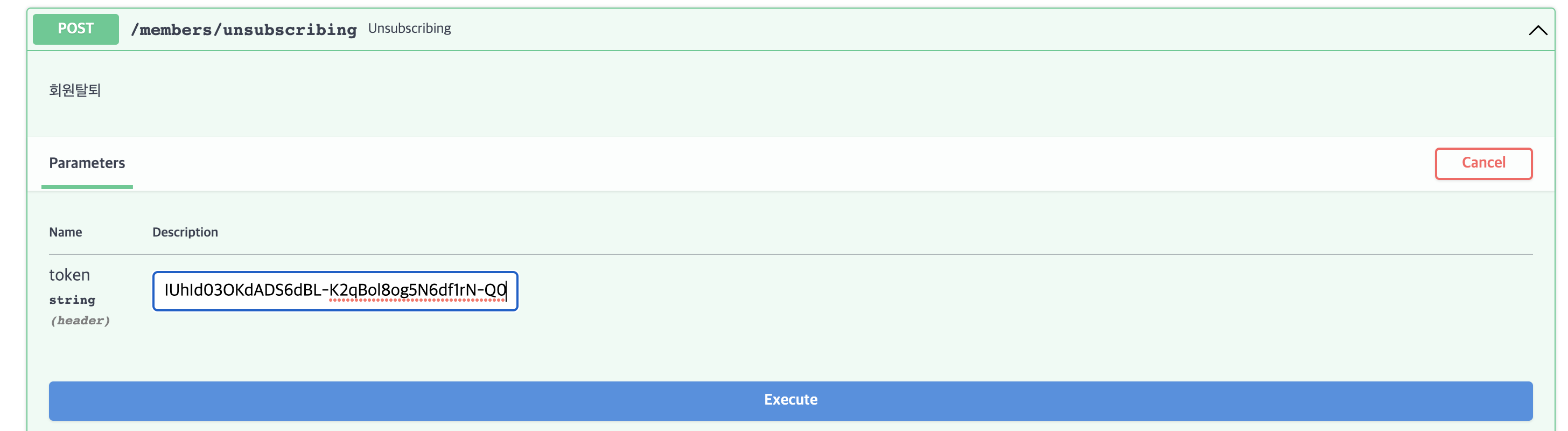 이미지를 보면 다른 이미지와 달리 parameters 항목이 추가된 것을 볼 수 있다. token 값에 JWT 값을 추가하면 된다.