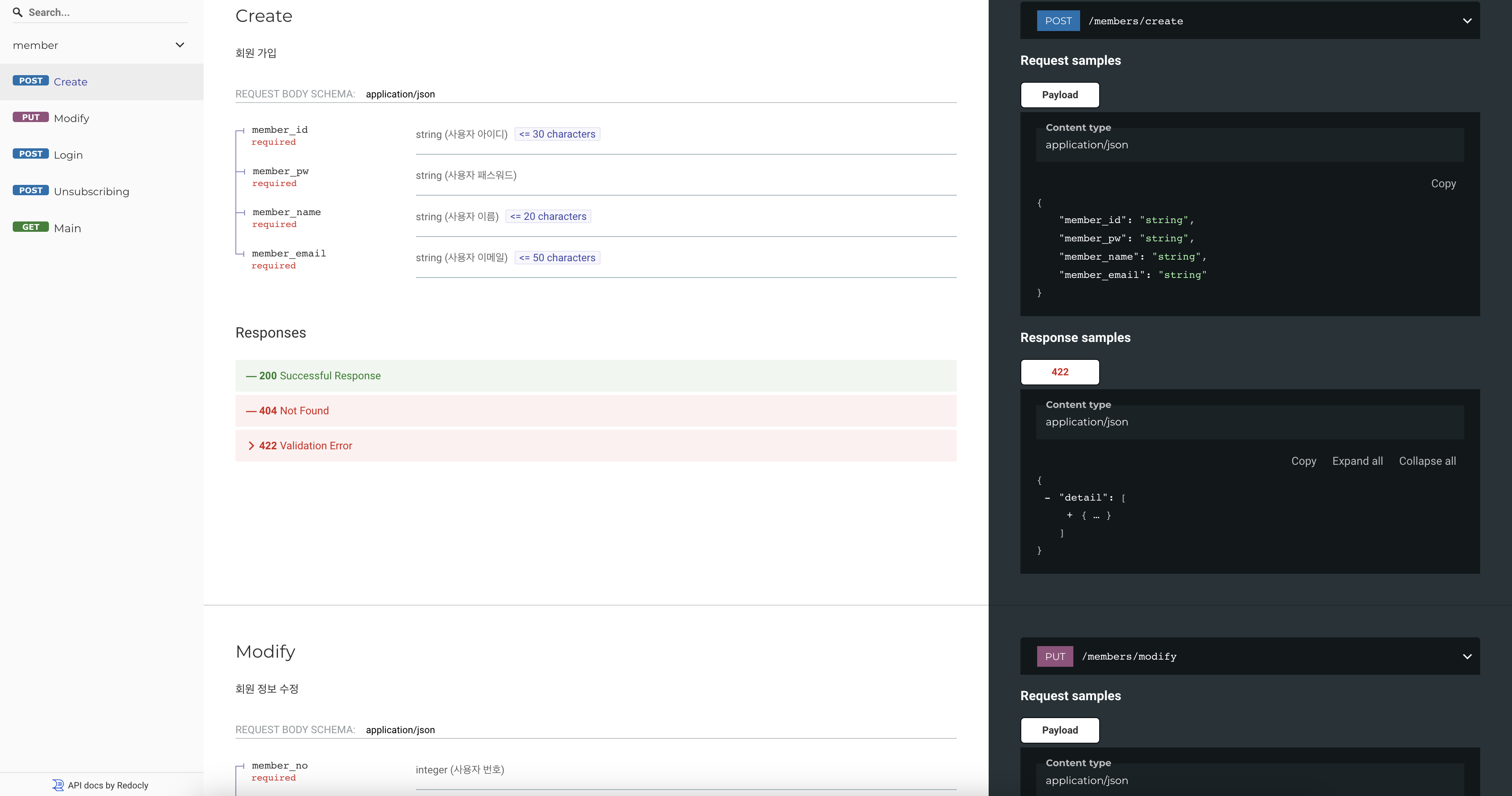 이제 routers/members.py 파일이 제법 코드 작동하는 코드 같이 보인다. 이렇게 해서 각 API 주소별로 request에서 어떤 parameter를 받고 수행 결과로 어떤 response를 전달하는지 모양을 만들었다.