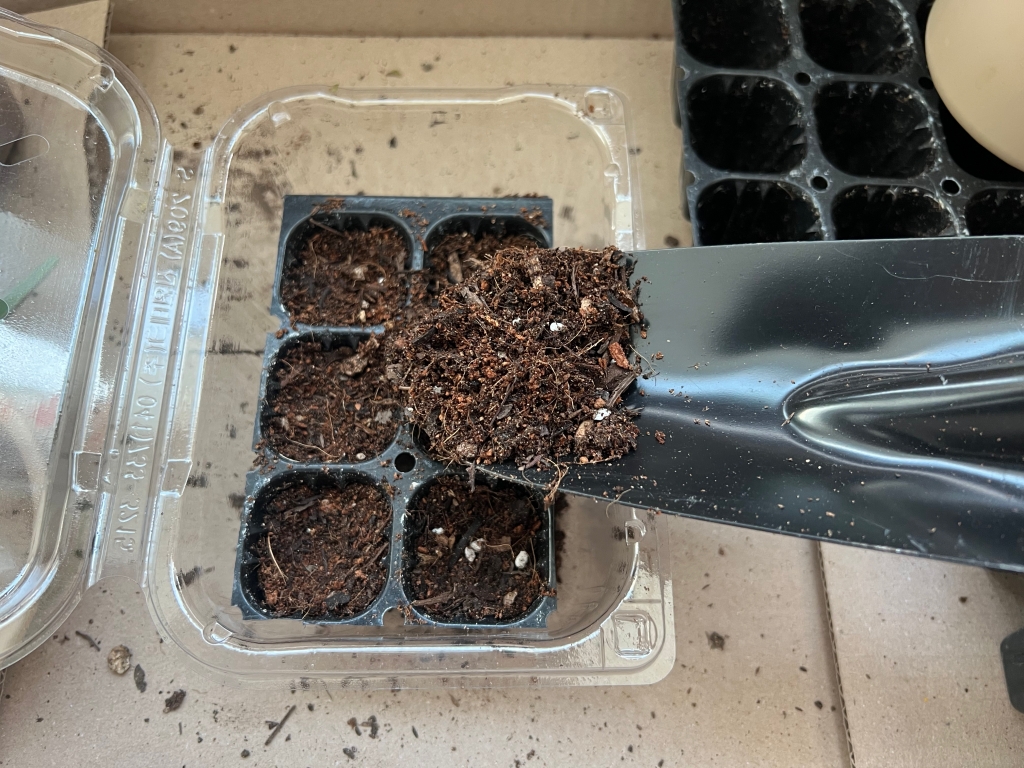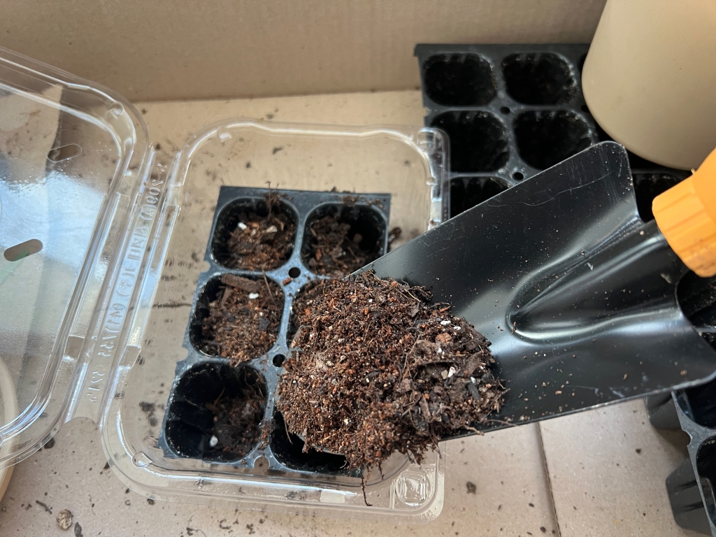 모종삽으로 조금씩 퍼서 담자. 어차피 트레이 안에 있으니 옆으로 좀 흘러도 상관없다.