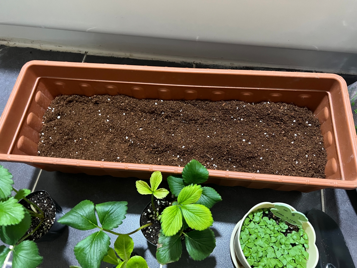 그리고 나서 바질부터 자리를 잡고 딸기를 오른쪽으로 붙여서 자리 잡고 마지막으로 가운데 상추를 심었다.