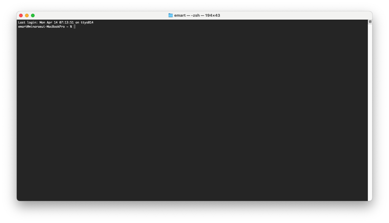 ⌘ + Space)을 열고 "Terminal" 또는 "터미널"을 입력한 후 Enter를 누릅니다. - 터미널 창이 열립니다.