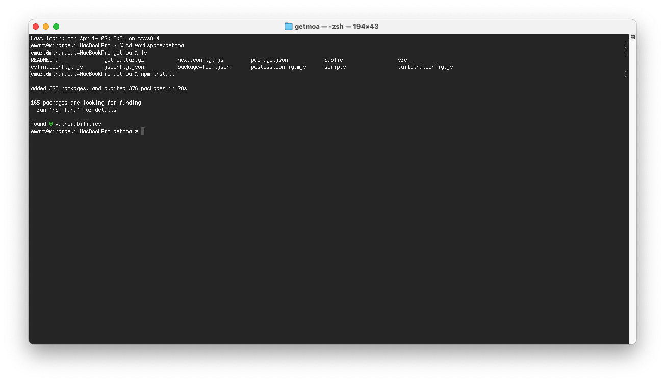 - 터미널에 다음 명령어를 입력하여 현재 사용자 이름을 확인합니다: