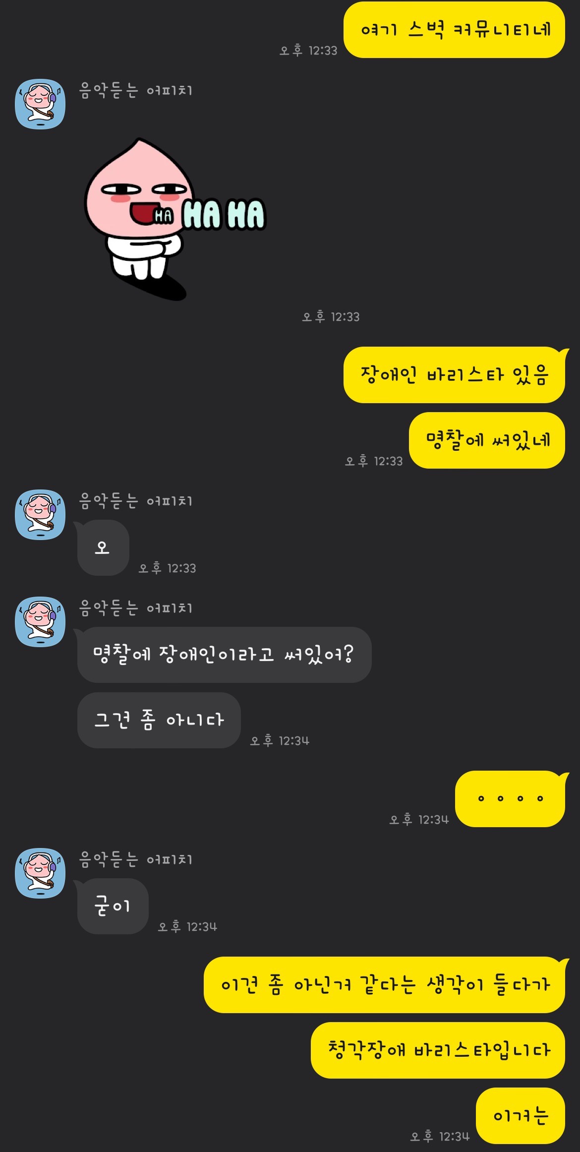 진상 고객은 누구나 힘든 것인데 그렇다고 난 신입이냐, 난 5년차야 이렇게 명찰을 들고 있지는 않는데 유난히 장애인들만 명찰을 달고 있는건 이상한 일이다. 그리고 스벅에서 일하는 지인과의 대화에서도 이 대화를 귀찮게 생각한다는걸 느꼈으며, 회사에서는 충분히 배려한 것이라는 입장이라는 것을 알게 되면서 딱 거기까지라는 생각이 들었다.
