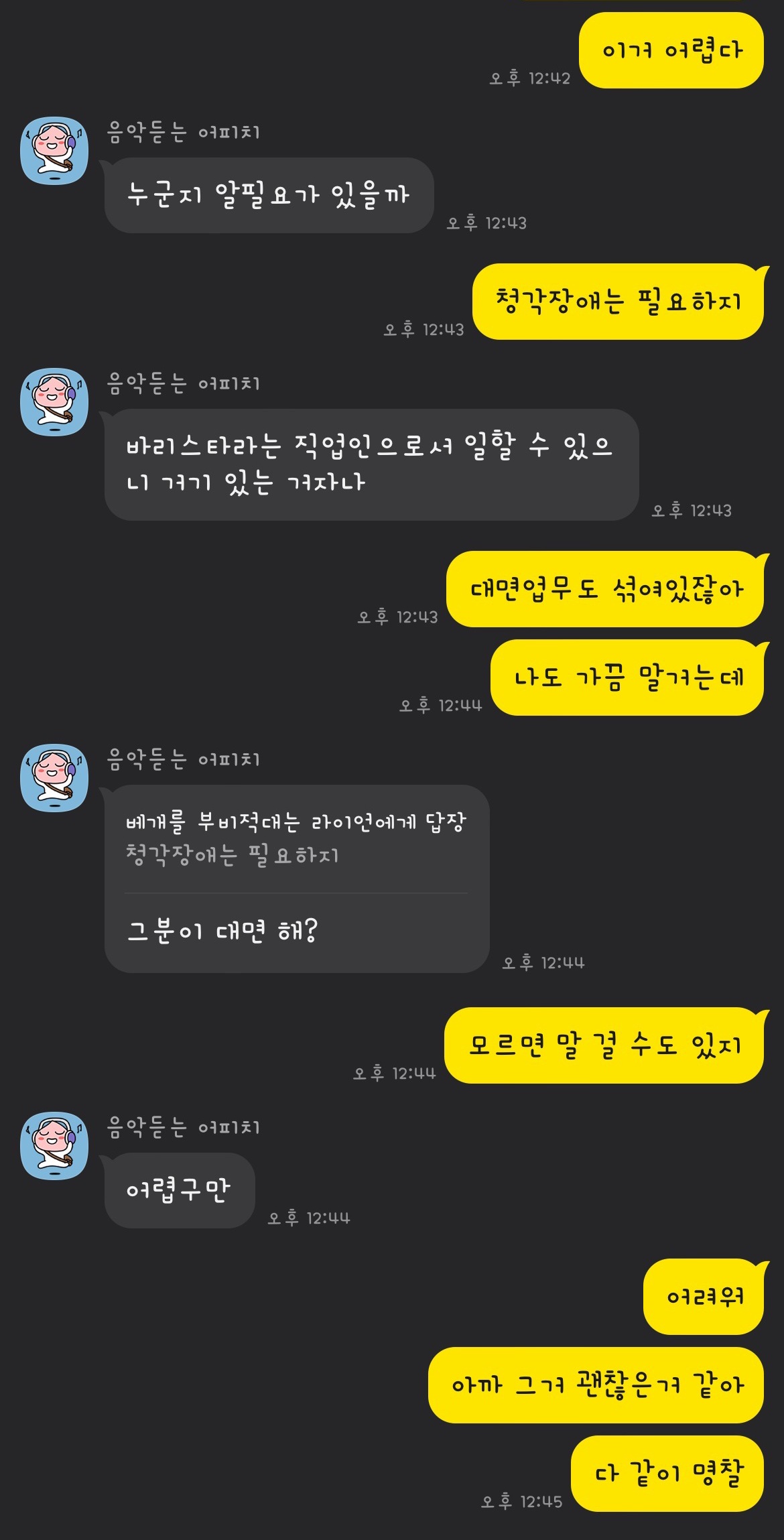 흠..우리는 장애인 파트너들과 일하고 있으니 조금 늦거나 서툴더라도 이해해달라 뭐 이런 의미로 해둔거 같다. 근데 그래도 뭔가 이상하다는 느낌은 지울 수 없다. 이런 생각에 아래처럼 와이프와 긴 카톡을 주고 받았다.