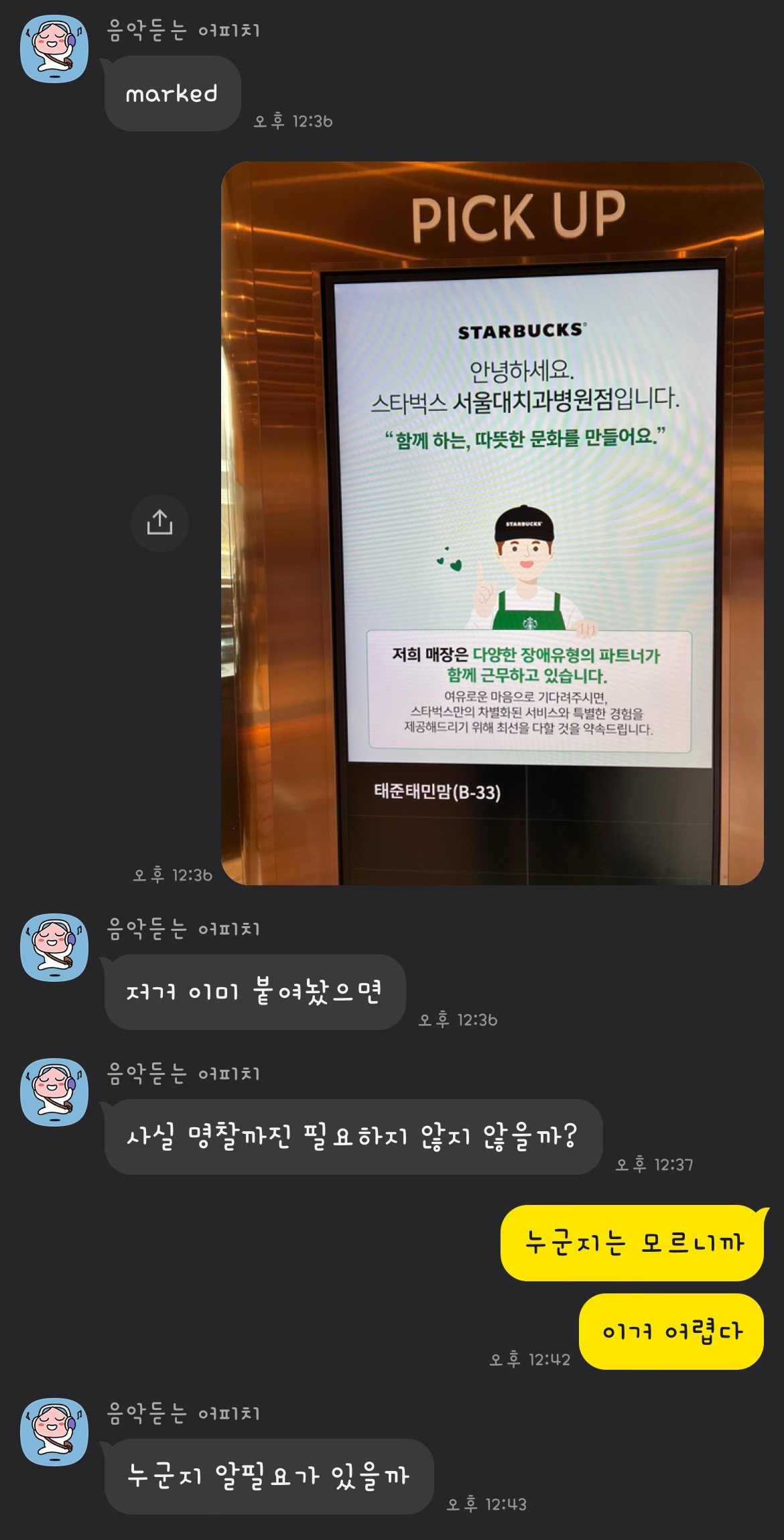 둘째 아이 병원 스케줄 때문에 서울대병원에 방문했다가 대기 시간이 너무 길어져서 커피가 필요했다. 관계사이니 할인율이 꽤 높아서 근래에 스타벅스를 애용하고 있는 관계로 가장 가까운 스타벅스를 찾아서 방문하였다. 점심시간이라서 사람이 너무 많아서 와이프에게 대기시간이 길어서 커피 사러 왔는데 여기도 사람이 많다는 카톡을 주고 받다가 우연히 스벅 매장을 정리하는 직원의 명찰이 눈에 들어왔다. 그리고 바로 이상하다는 생각이 스쳐지나갔다.