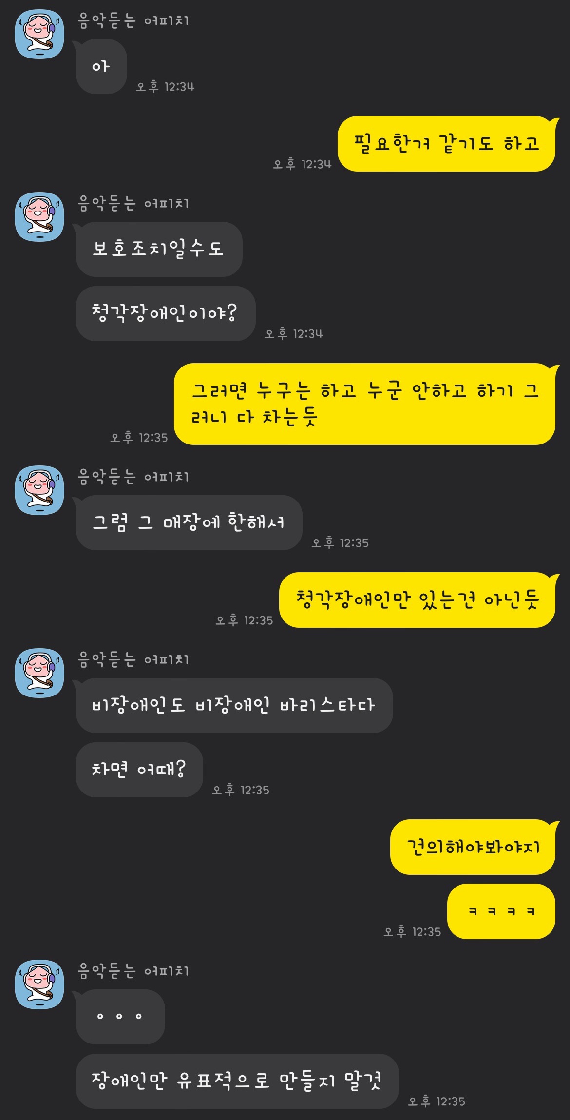 진상 고객은 누구나 힘든 것인데 그렇다고 난 신입이냐, 난 5년차야 이렇게 명찰을 들고 있지는 않는데 유난히 장애인들만 명찰을 달고 있는건 이상한 일이다. 그리고 스벅에서 일하는 지인과의 대화에서도 이 대화를 귀찮게 생각한다는걸 느꼈으며, 회사에서는 충분히 배려한 것이라는 입장이라는 것을 알게 되면서 딱 거기까지라는 생각이 들었다.