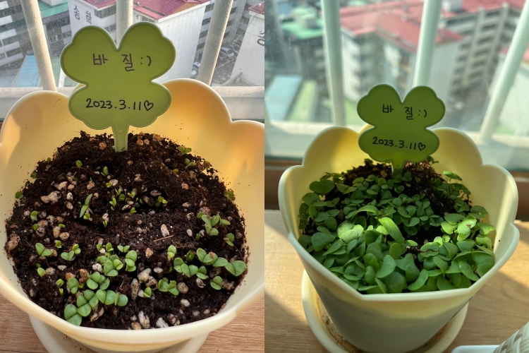 사진은 점심에 찍어두었는데 지금 다시 보니 가운데 사이에서도 싹이 올라온다. 씨가 너무 많아서 그냥 흩뿌려두었는데 모든 씨가 발아해서 올라오는거처럼 사방으로 올라온다.