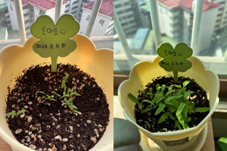 더디 자라서 걱정했던 토마토는 어느새 바질보다 크게 자랐다. 곧 분갈이해서 큰 화분에 듬성듬성 옮겨심어주어야 할 듯하다.