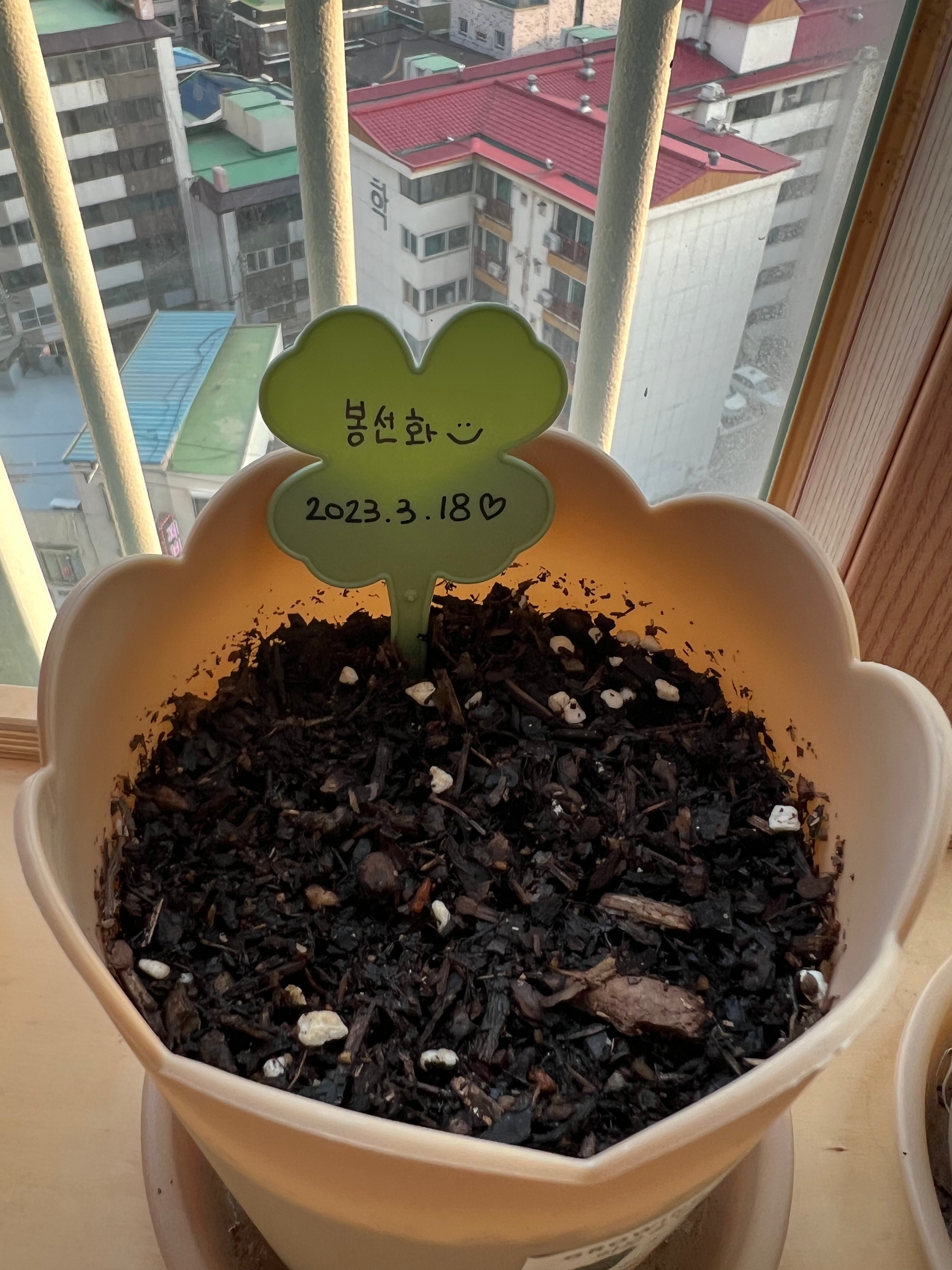 흙이 모자라서 가장 마지막에 심은 봉선화 화분. 다른 아이들보다 일주일 늦게 심었으니 잘 지켜보면 얘네 잘 자랄거라고 믿는다.