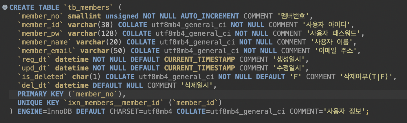 Concept 프로그램을 만들면서 가장 기본이 되는 기능이 바로 회원 정보를 관리하는 것이다. 생성되는 모든 정보는 회원 정보에 종속되게 되므로 회원의 정보를 잘 관리하는 것이 매우 중요하다. 이 프로젝트에서는 회원의 많은 정보를 사용하지 않는다. 이전에 공유했던 회원 정보 테이블을 다시 보자. CREATE TABLE `tb_members` ( `member_no` smallint unsigned NOT NULL AUTO_INCREMENT COMMENT '멤버번호', `member_id` varchar(30) COLLATE utf8mb4_general_ci NOT NULL COMMENT '사용자 아이디', `member_pw` varchar(128) COLLATE utf8mb4_general_ci NOT..